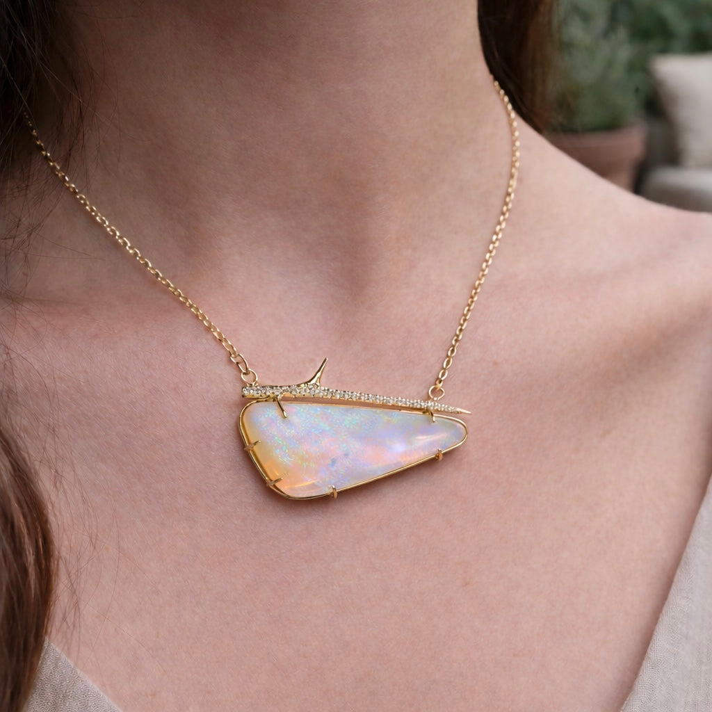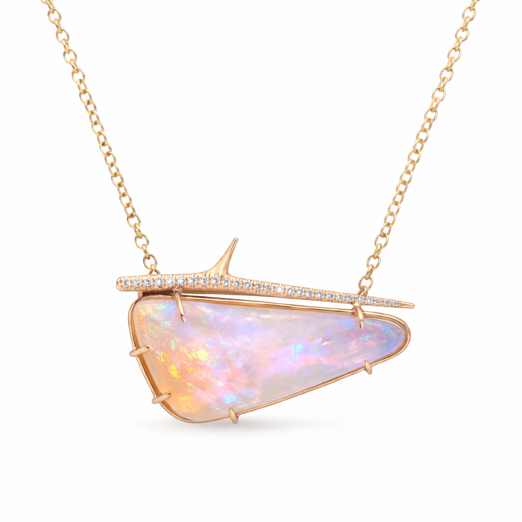 This gorgeous one of a kind solid Australian Lightning Ridge Crystal opal necklace hangs from our diamond thorn.
