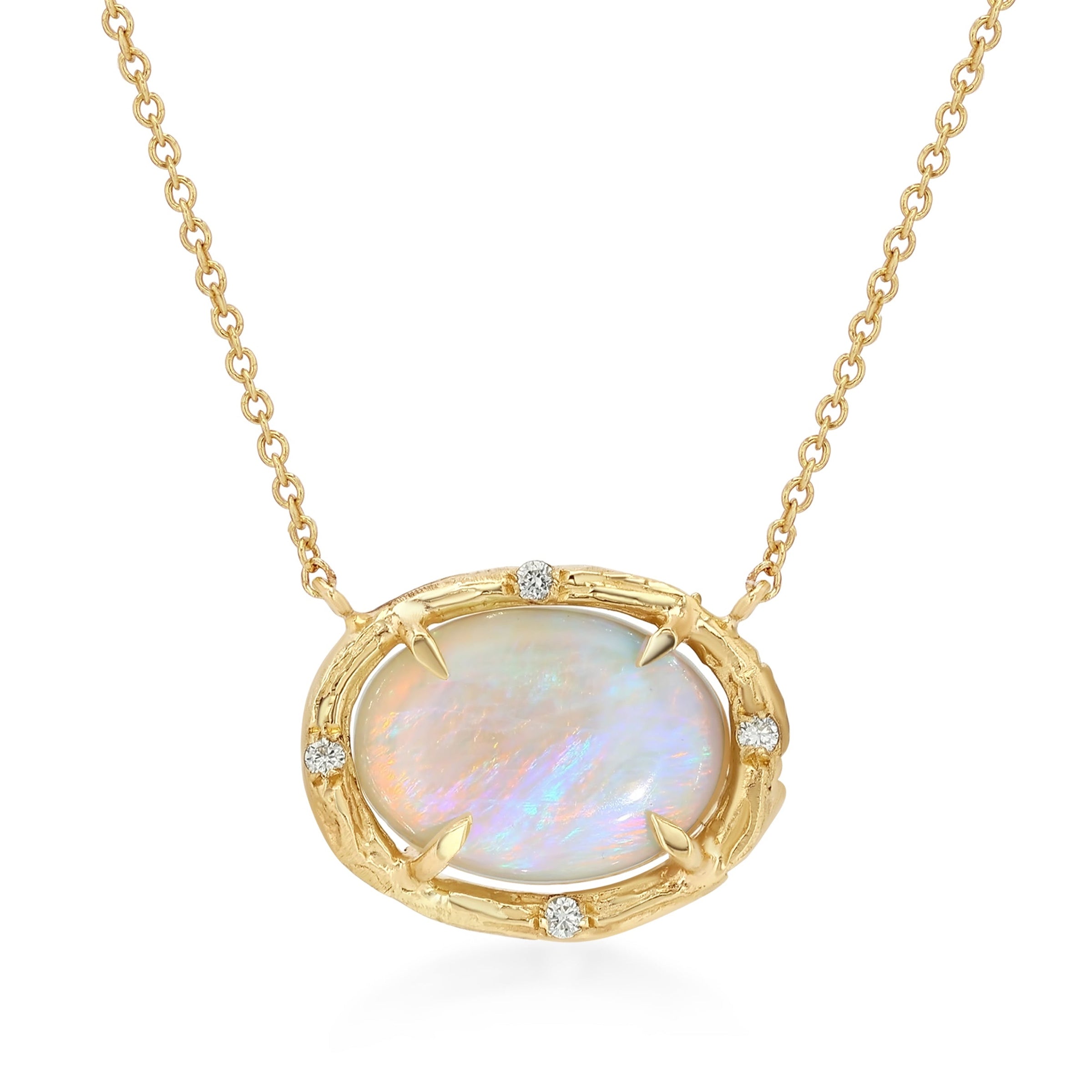 This gorgeous one of a kind solid Lightning Ridge Australian opal necklace is set in our willow wire with scattered diamonds.