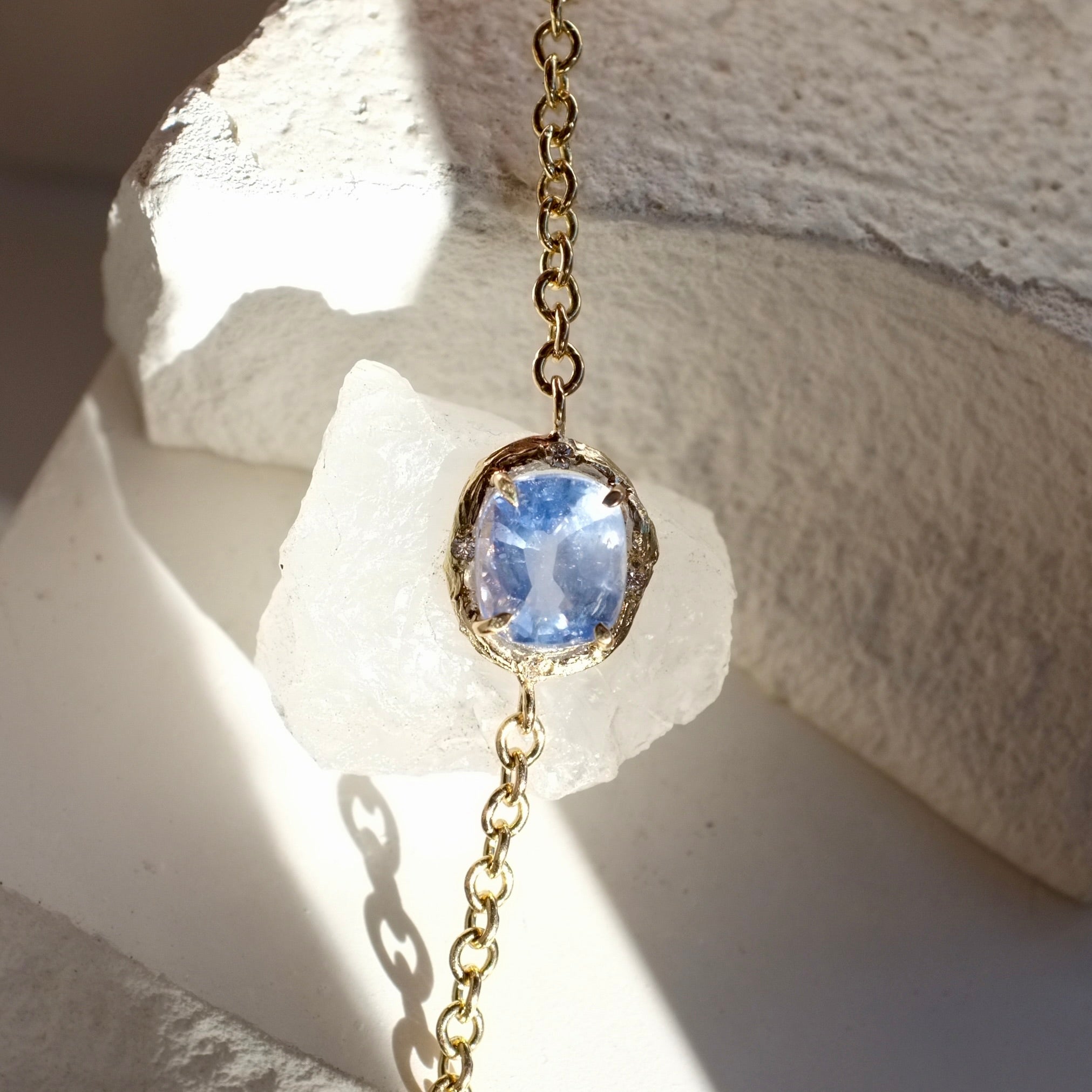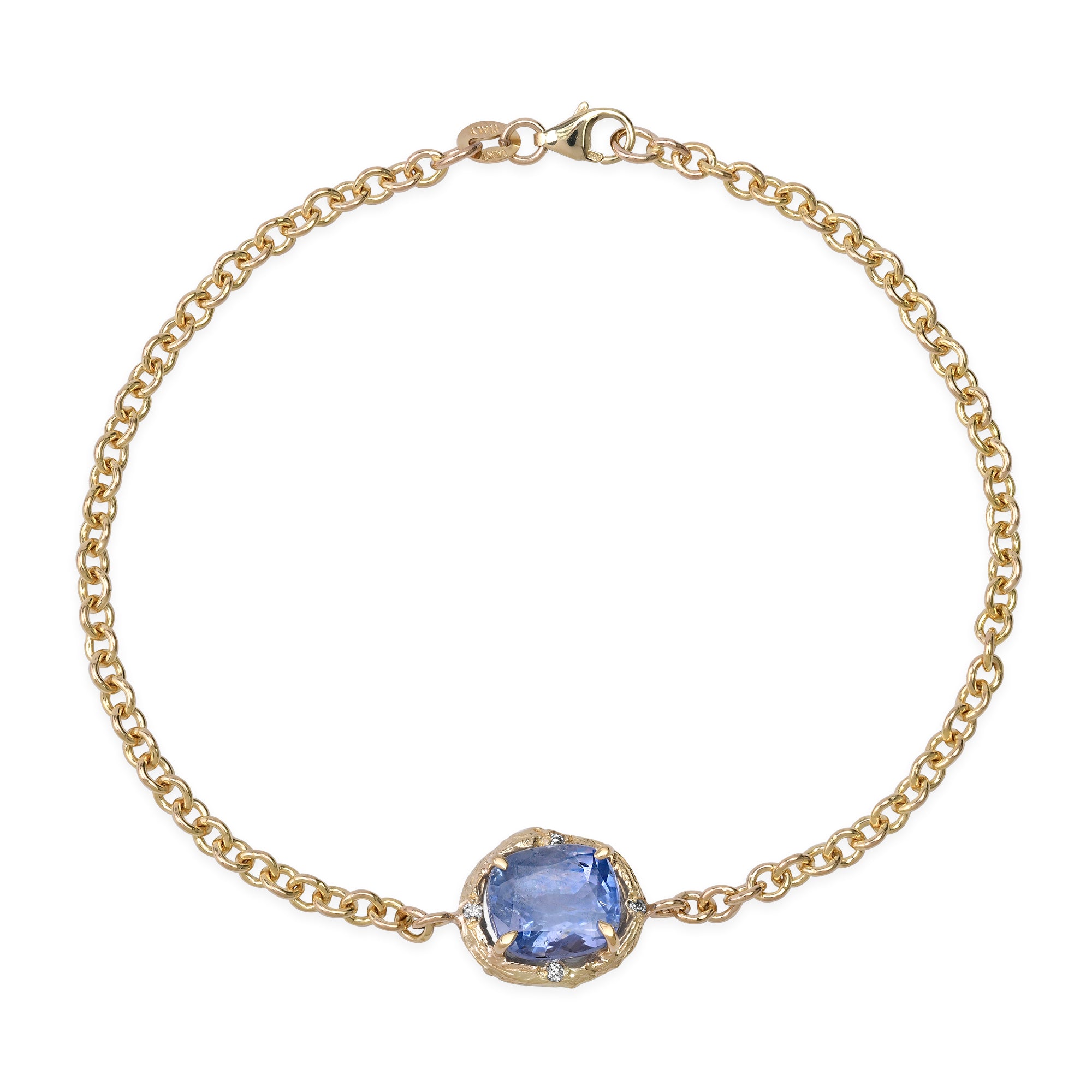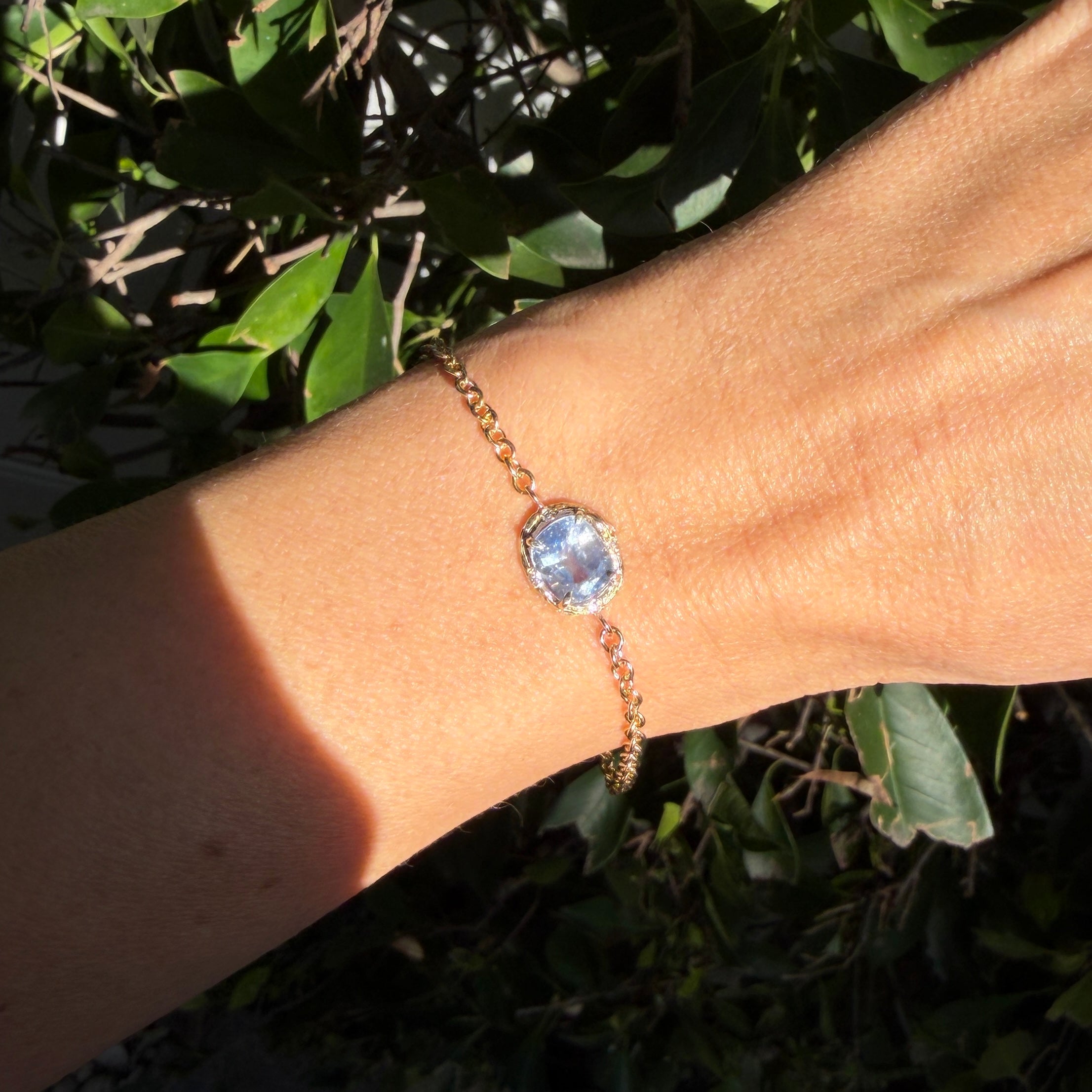 Majestic and grounding, this bracelet features an all-natural Ceylon sapphire set in solid 14K gold. The setting is cast directly from a willow tree branch, preserving the organic curve and texture in precious metal. Diamonds are delicately hand set into the golden bark. Handmade in Los Angeles.