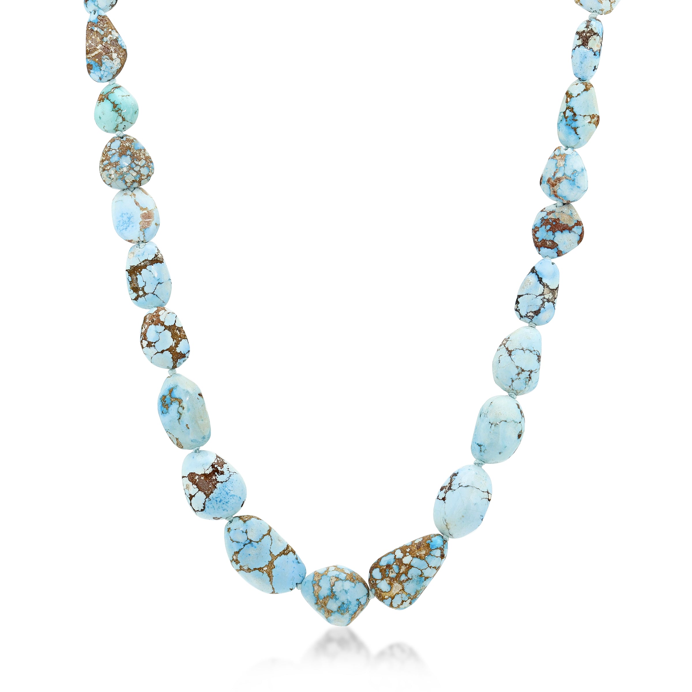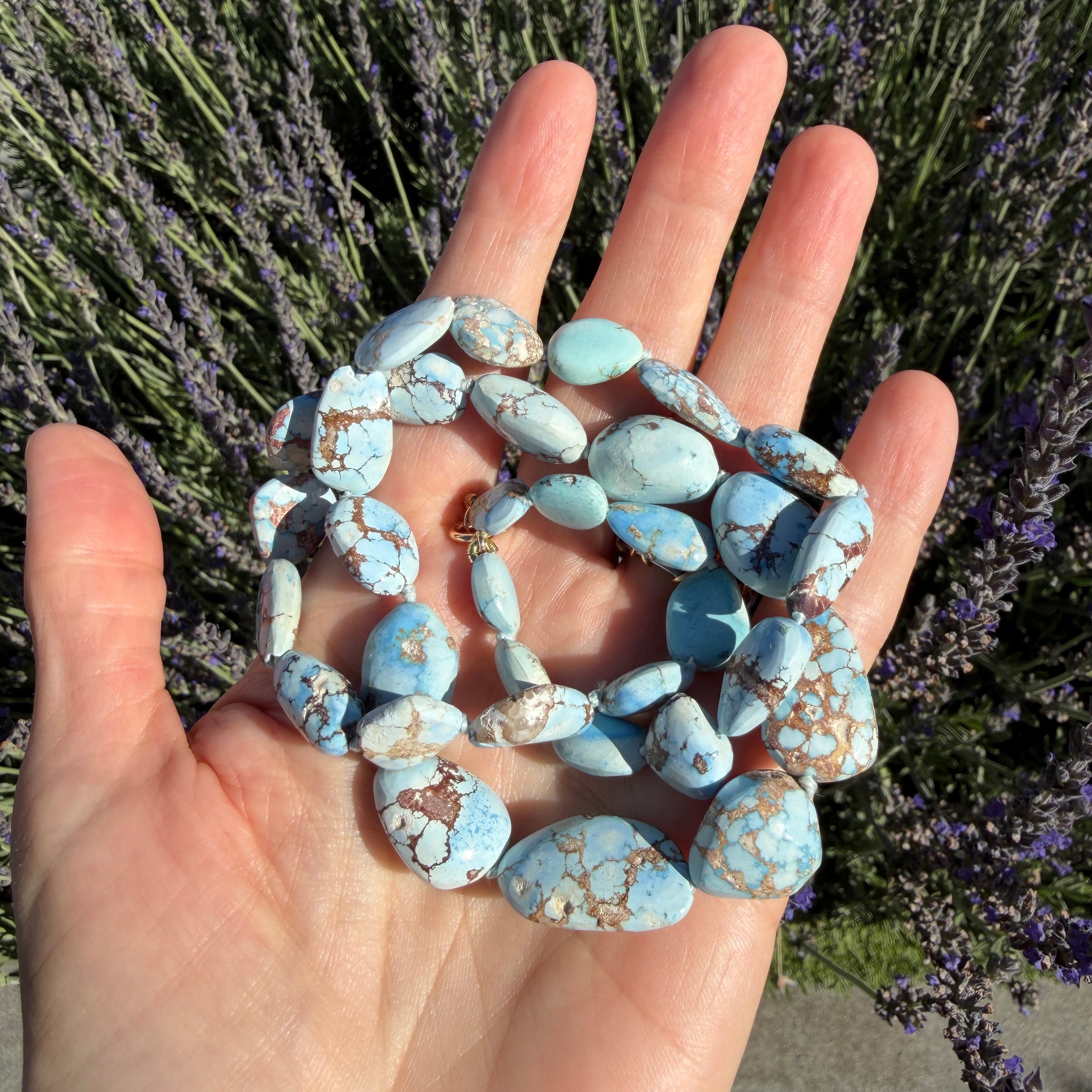 This one of a kind lavender turquoise necklace is hand knotted and set with a 14k gold clasp.