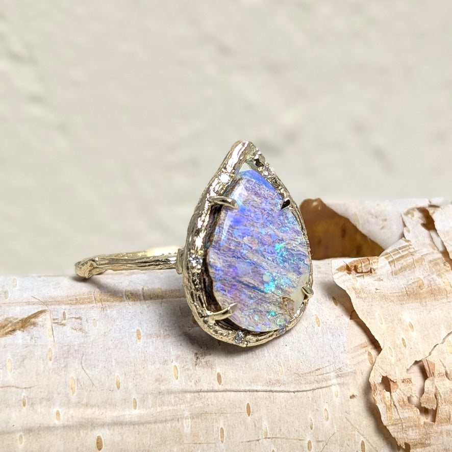 This on of a kind Australian opal has the most unique pattern and flashes of green, blue and purple. Wrapped in our willow branch wire, you can see ancient fossilized wood emerging from beneath the lilac hue. ***Please specify size in checkout notes.