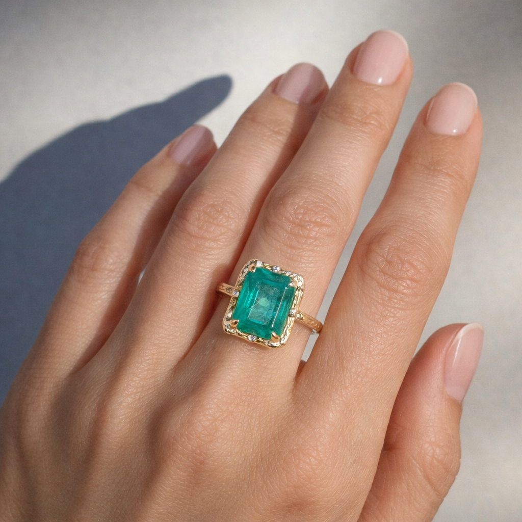 This Zambian emerald ring is set with diamonds in our willow branch band. Emeralds are known to have qualities of growth, reflection, love and peace. Willows are know for their ability to bend without breaking. Please leave size in checkout.