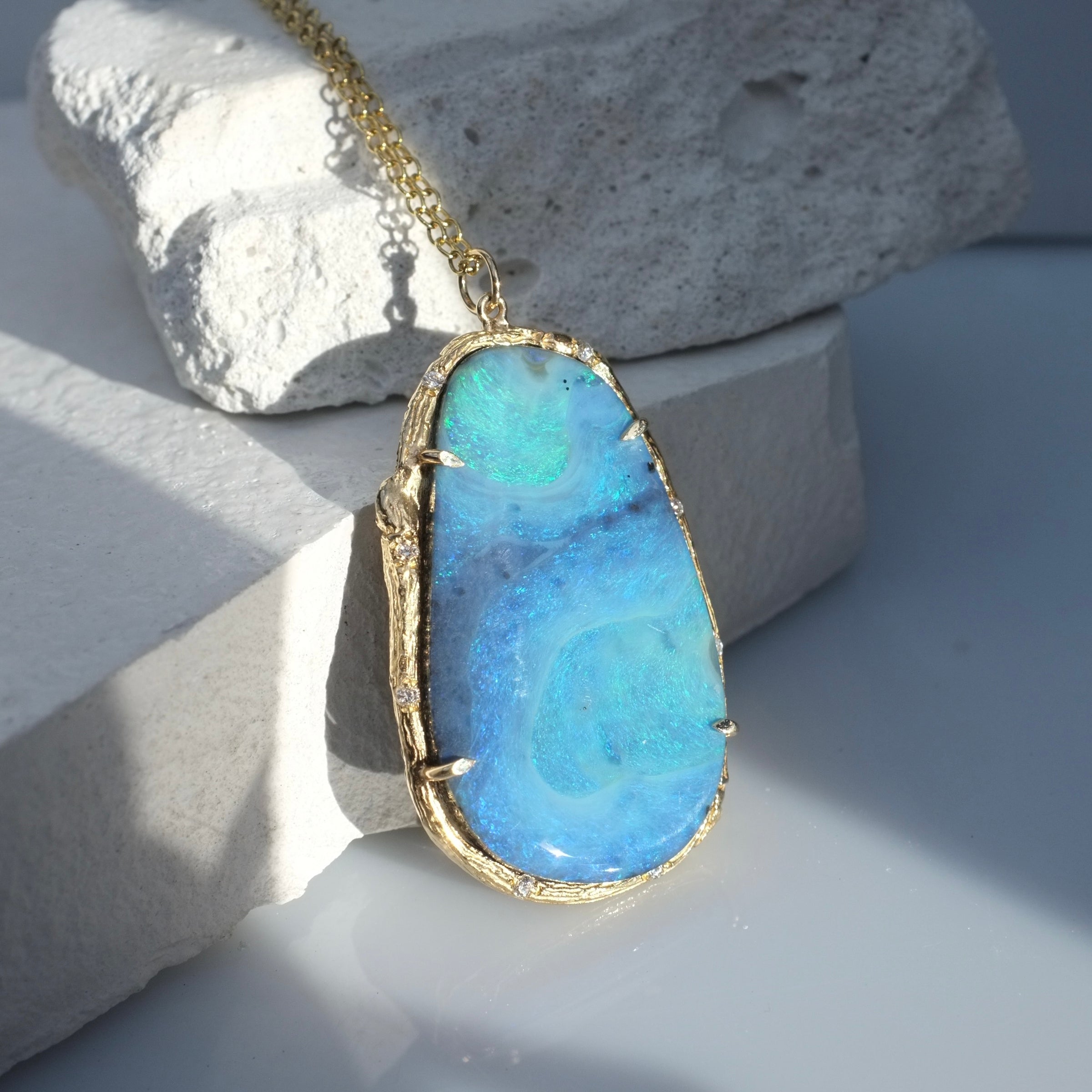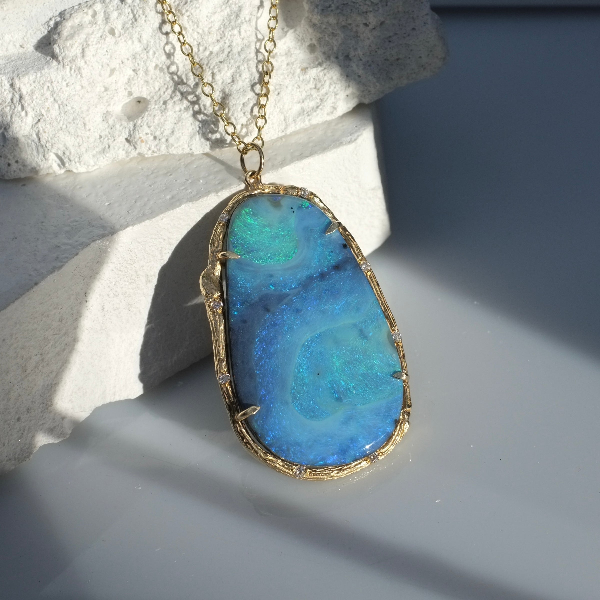 This beautiful one of a kind solid Australian boulder opal necklace is set with our willow branch featuring the colors green and blue.