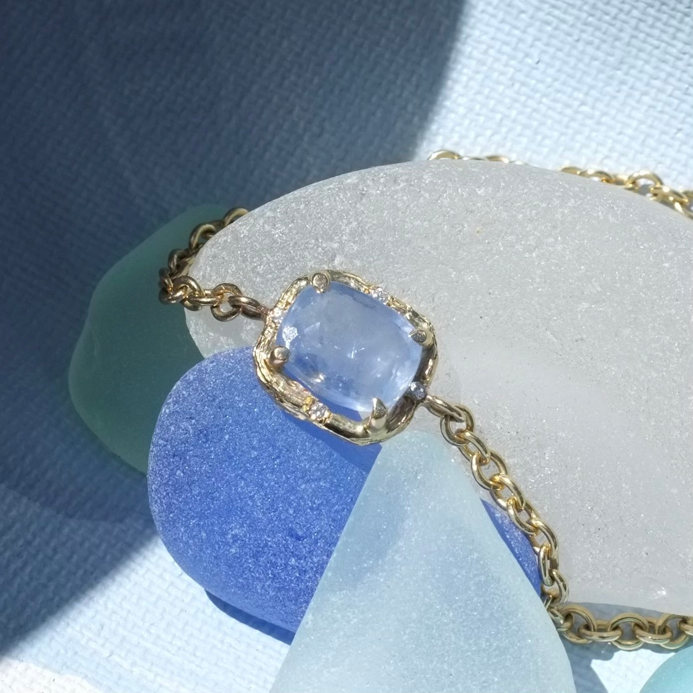 Majestic and grounding, this bracelet features an all-natural Ceylon sapphire set in solid 14K gold. The setting is cast directly from a willow tree branch, preserving the organic curve and texture in precious metal. Diamonds are delicately hand set into the golden bark.