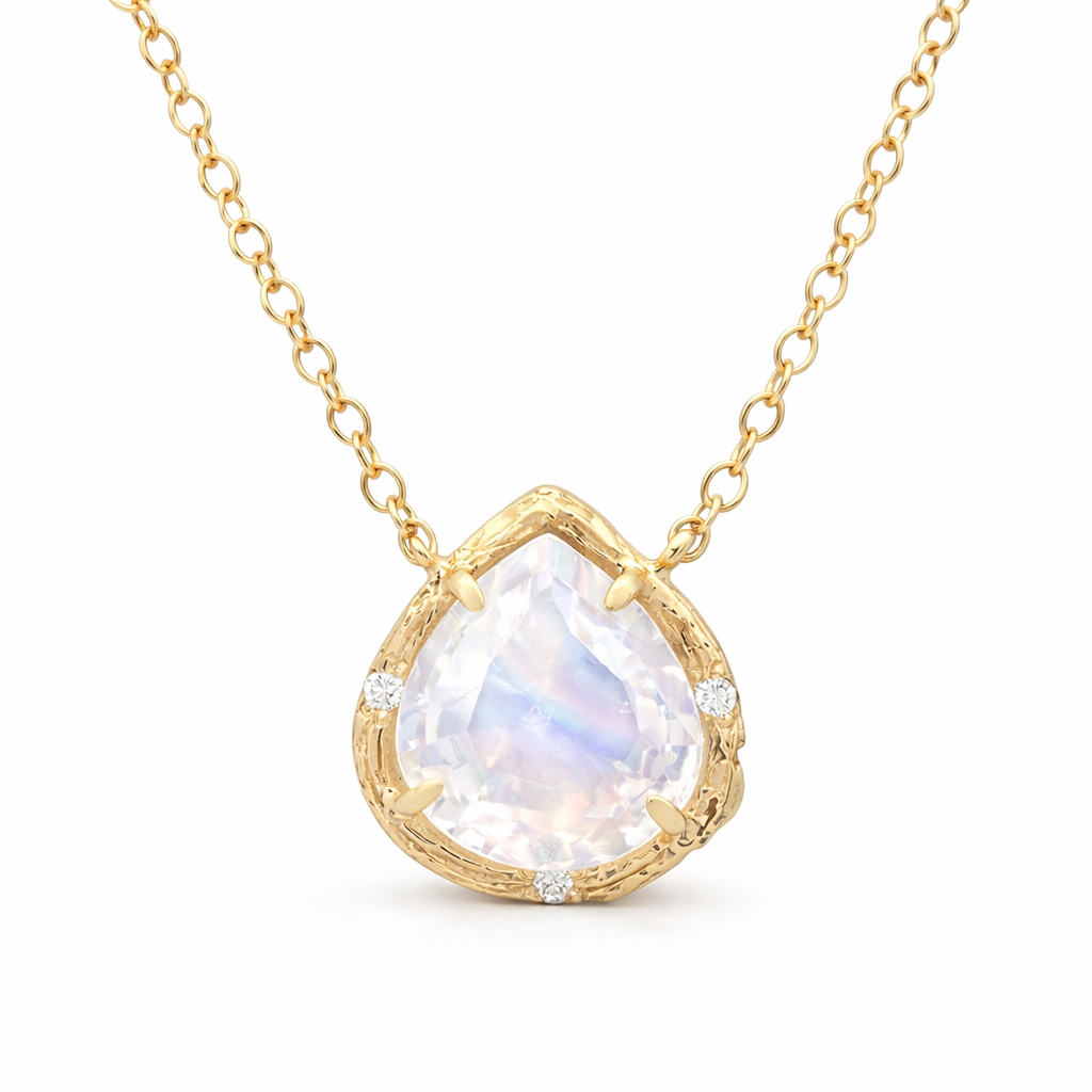 This one of a kind moonstone necklace is hand set in our willow branch wire with diamonds scattered along the branch.