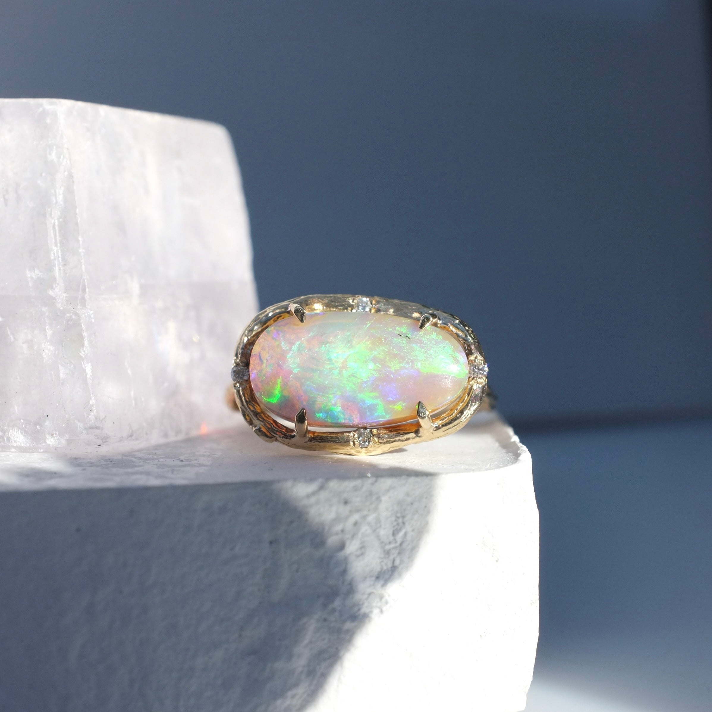 This one of a kind Australian opal has the most unique pattern and flashes of green, blue and purple. Wrapped in our willow branch wire, you can see ancient fossilized wood emerging from beneath the lilac hue. ***Please specify size in checkout notes.