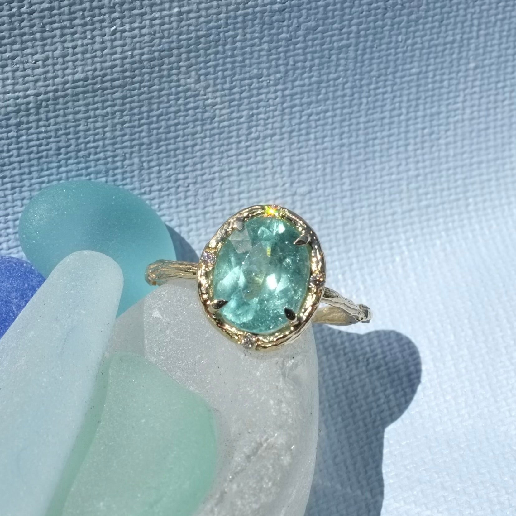 This glowing Brazilian aqua tourmaline ring is accented by diamonds along the willow branch band. Tourmaline attracts inspiration, compassion and prosperity.