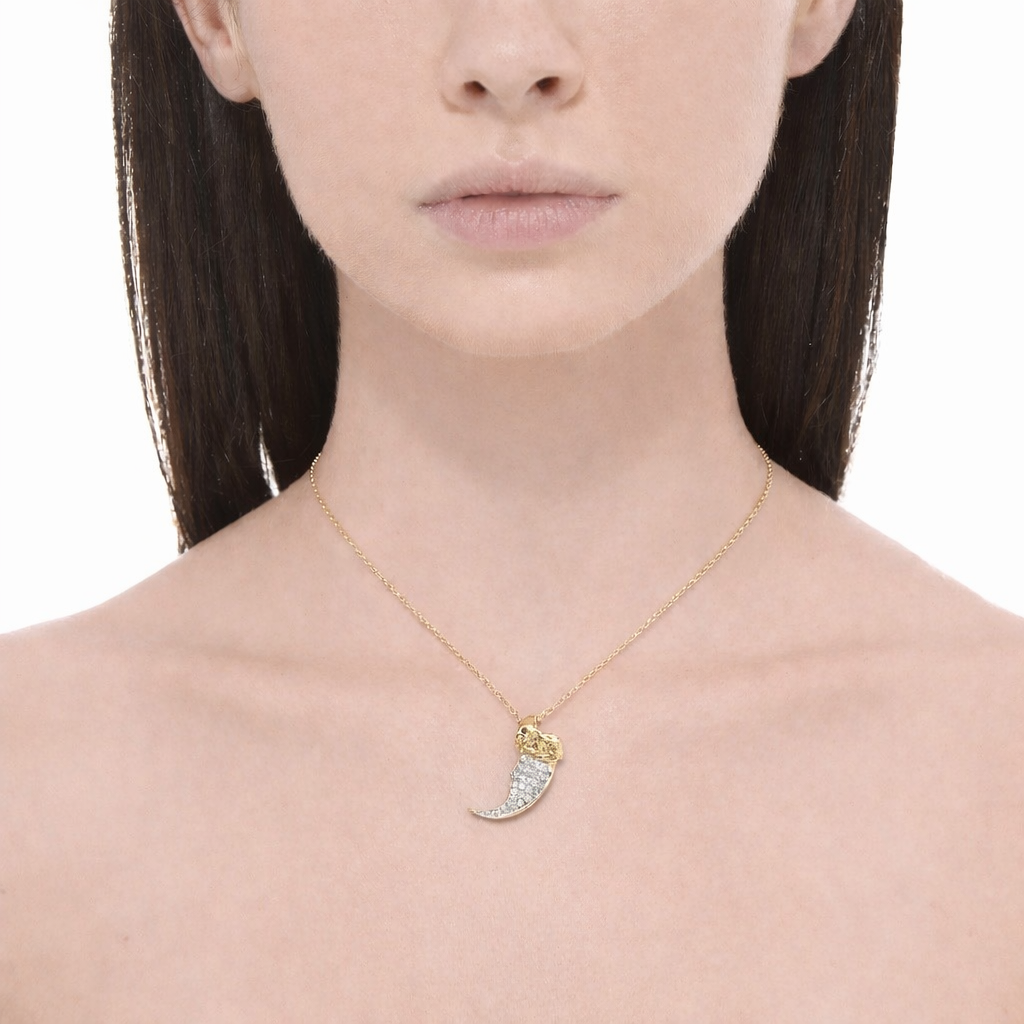 The Wolverine is clever, courageous, fierce, persistent and passionate. Our classic wolverine claw pendant has shimmering hand set diamonds and is cast into solid gold.